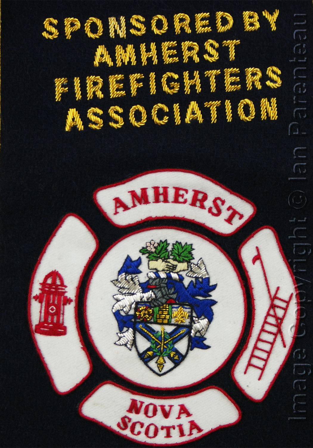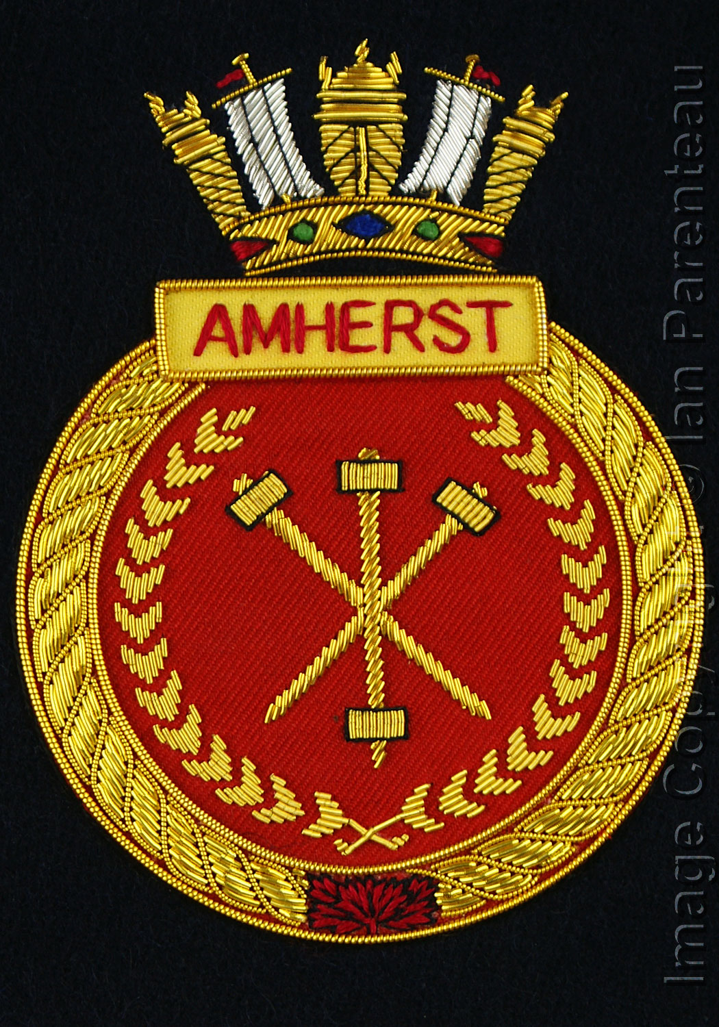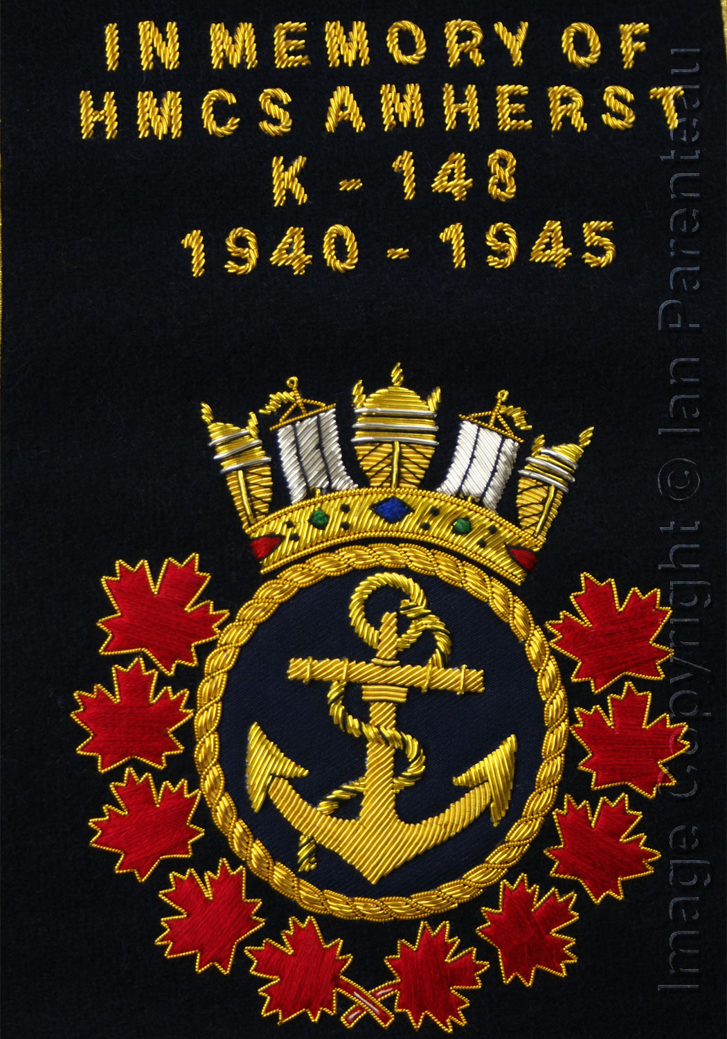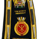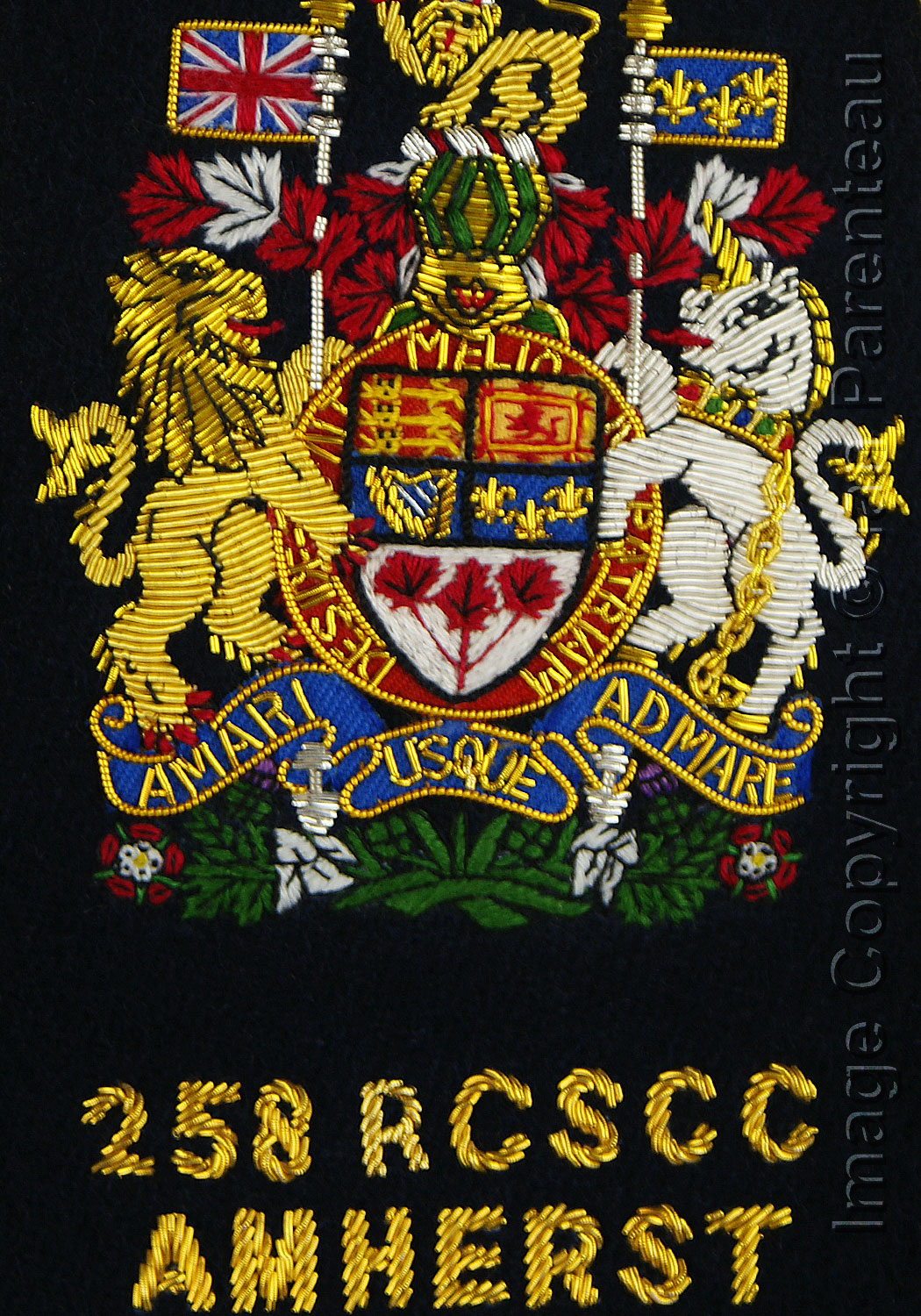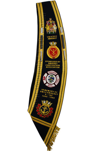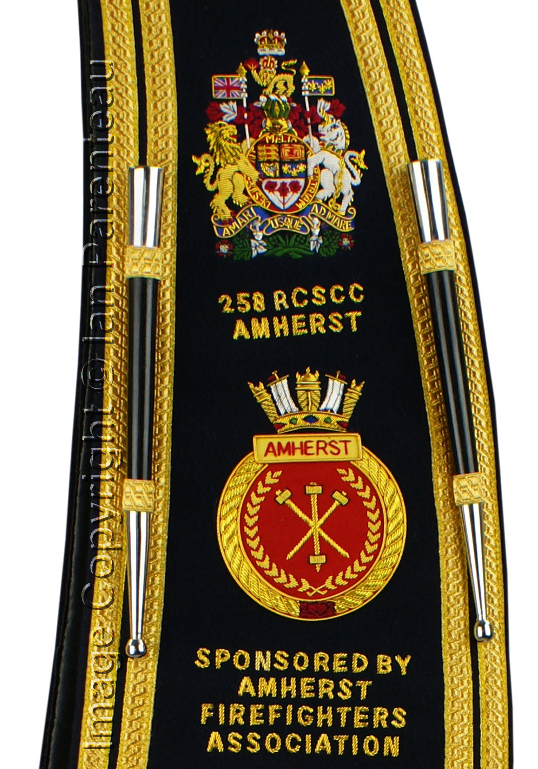 This gold on black hand embroidered baldric sash was custom made for a Royal Canadian Sea Cadets Band. Features include: |