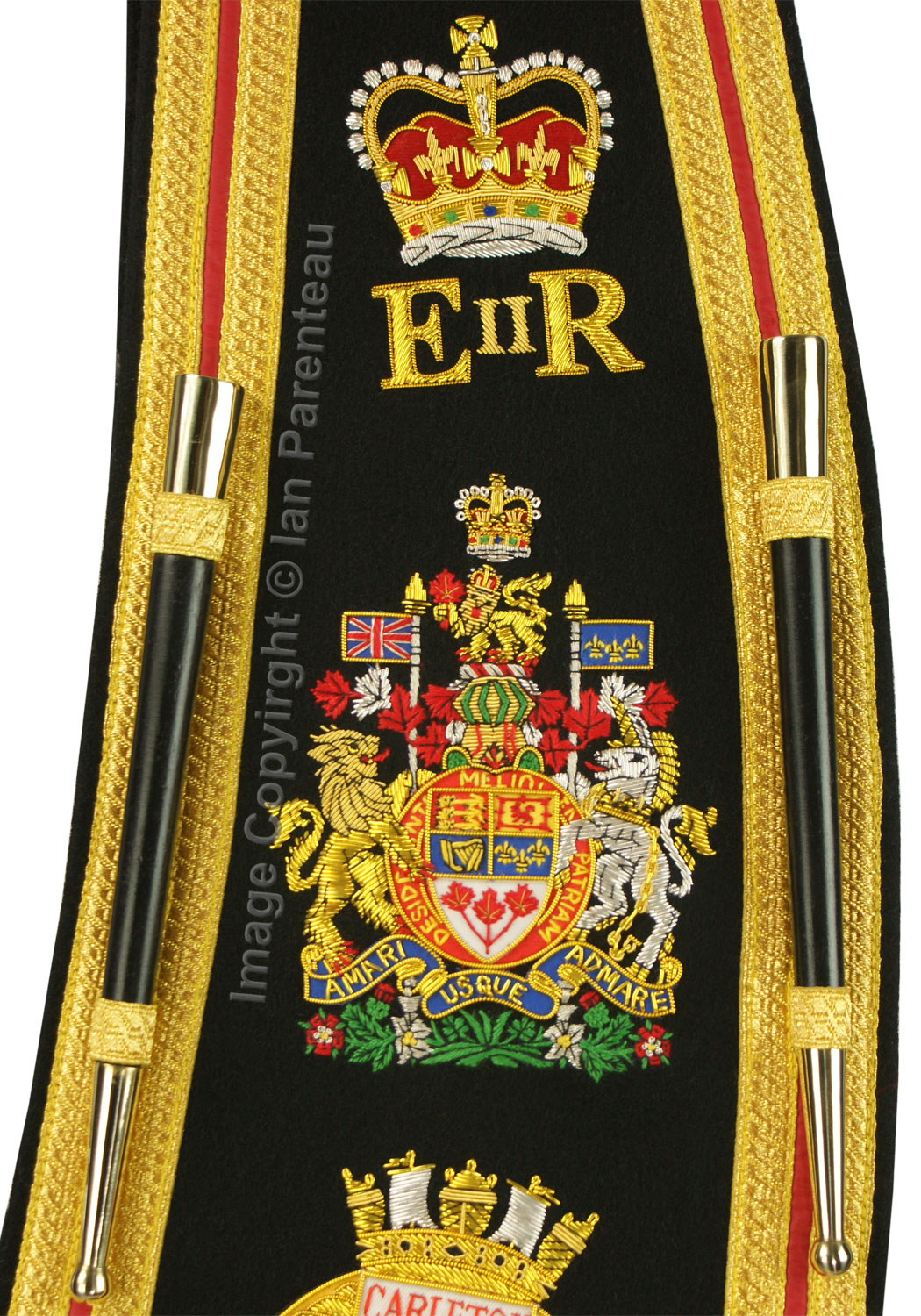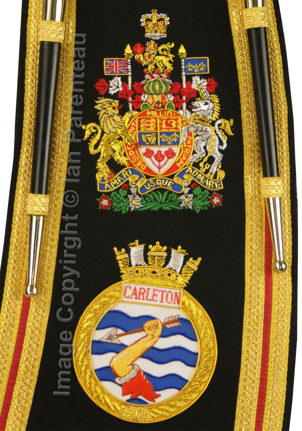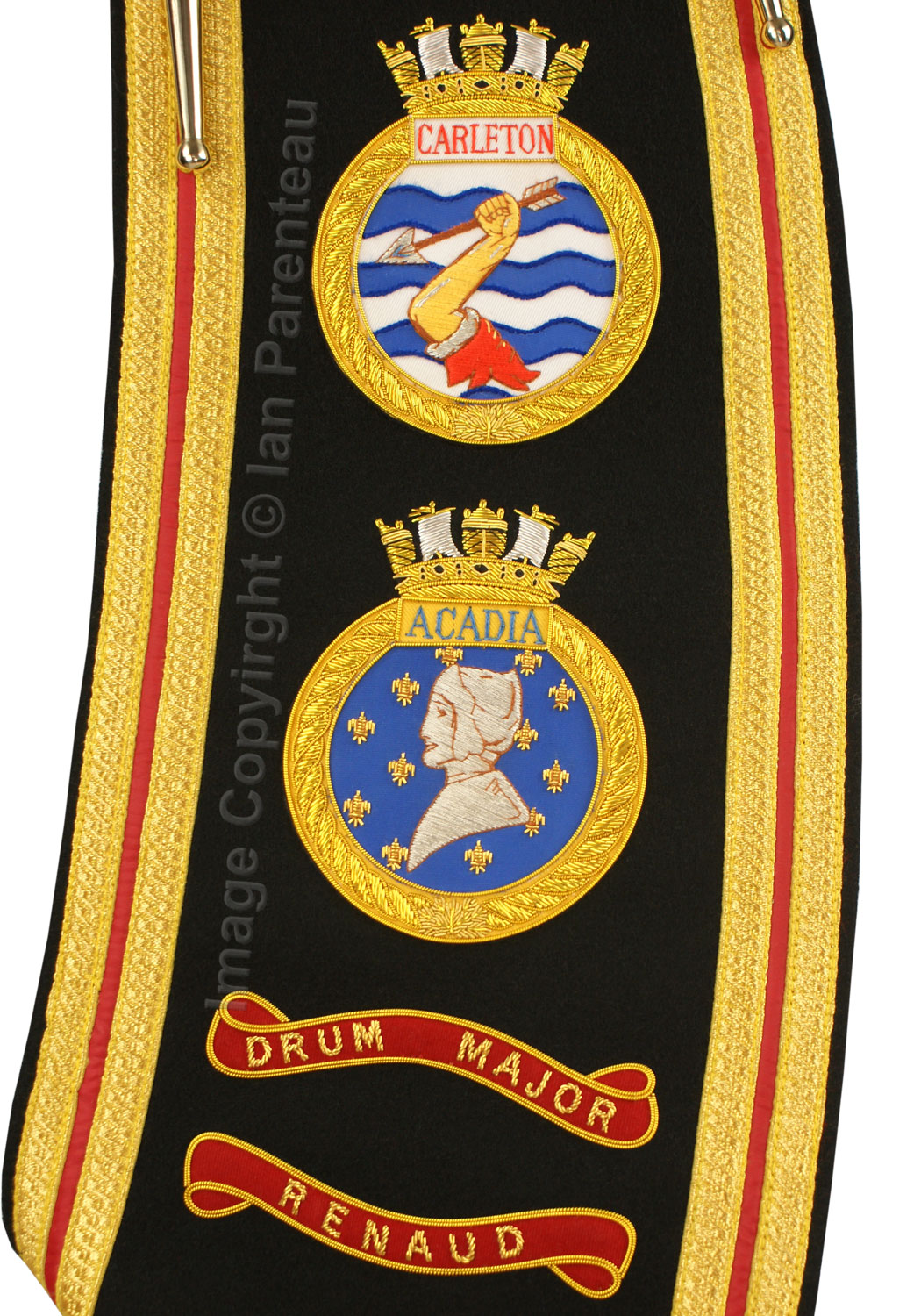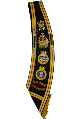 This gold on black background hand embroidered baldric sash was custom made for the HMCS Carleton band. Features include: |