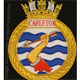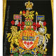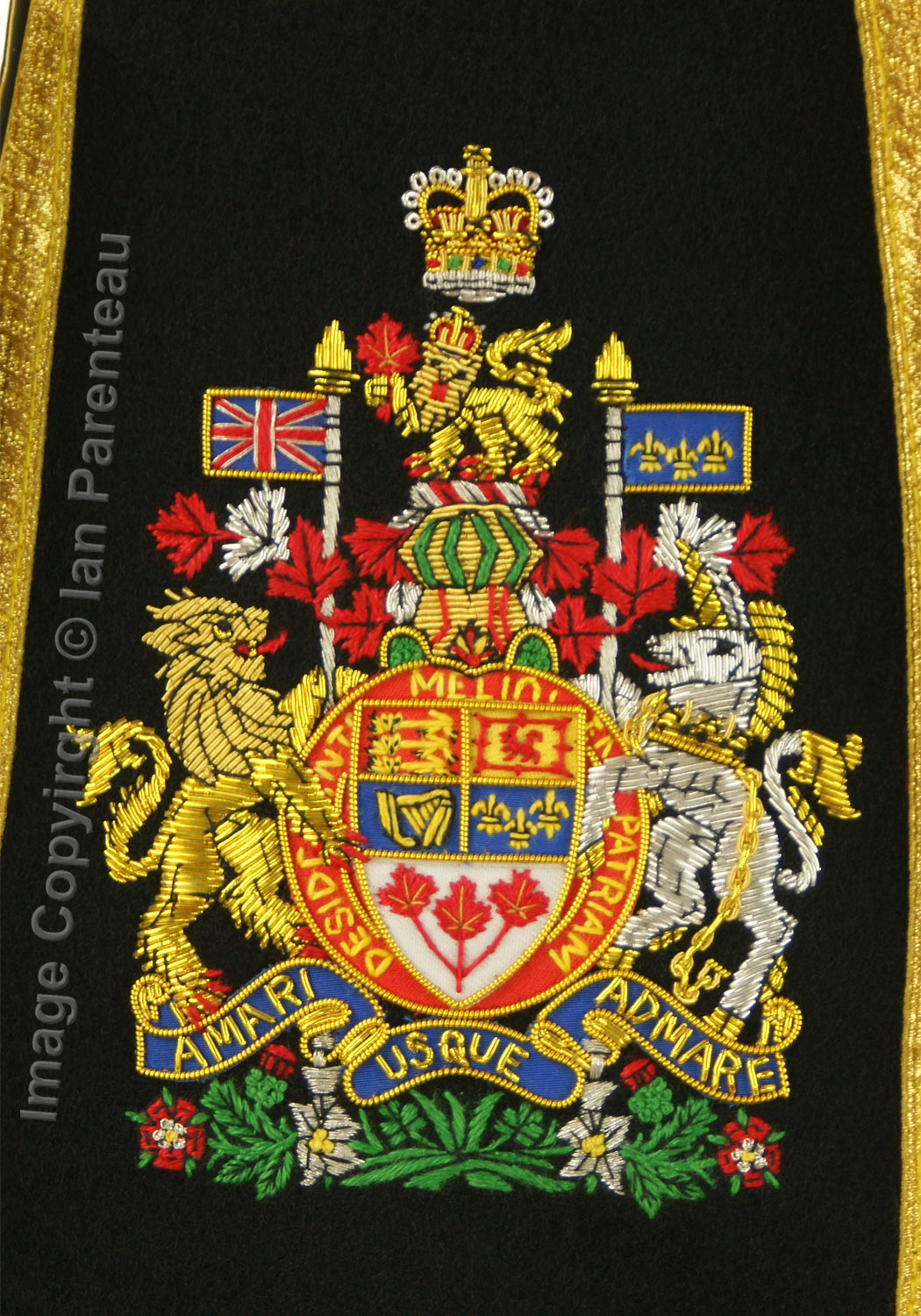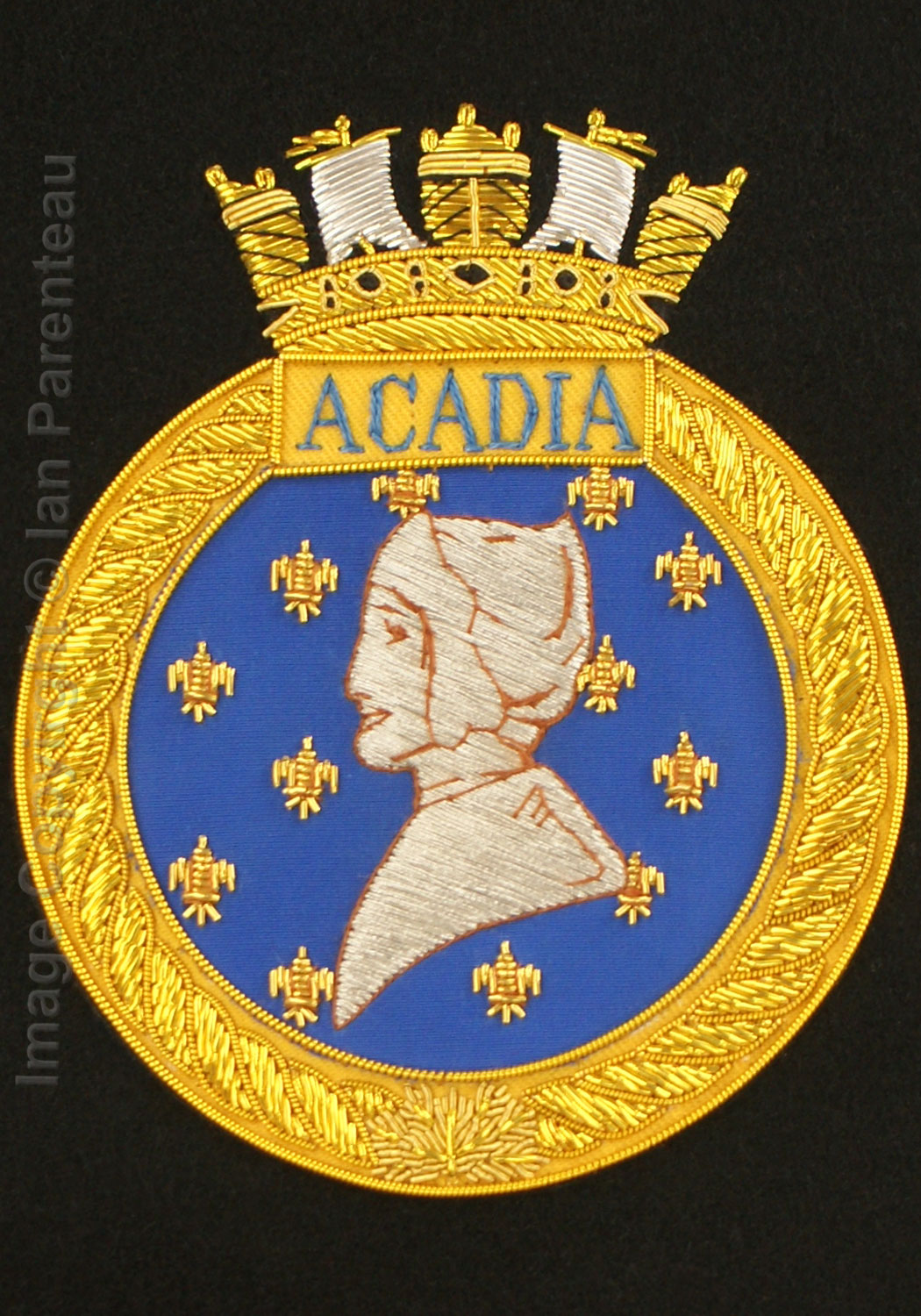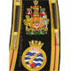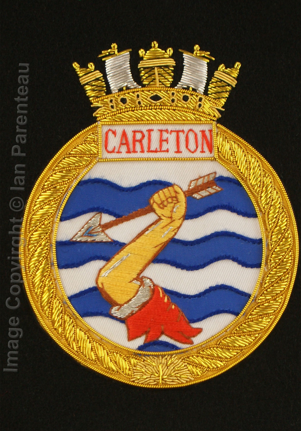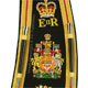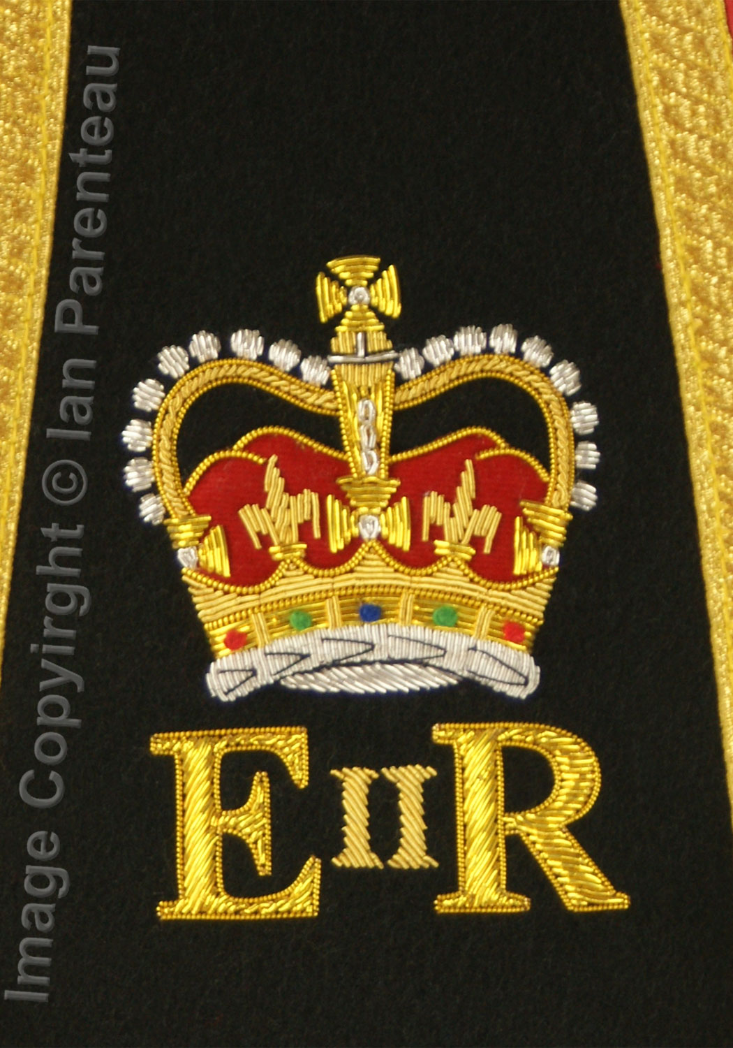 This gold on black background hand embroidered baldric sash was custom made for the HMCS Carleton band. Features include: |