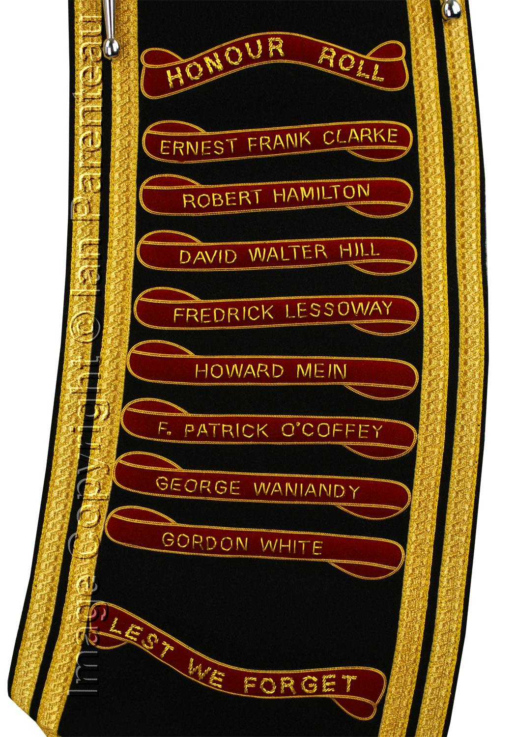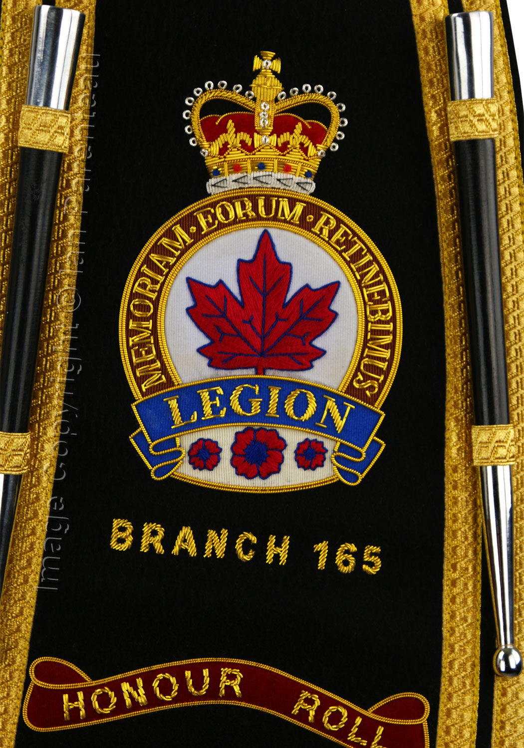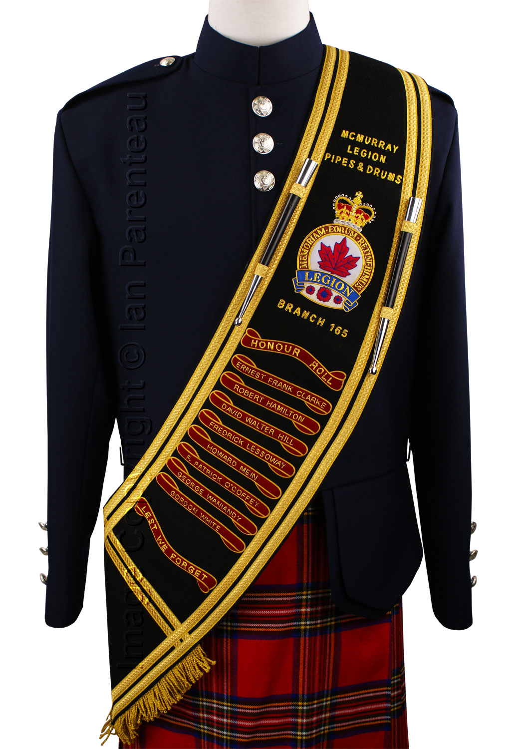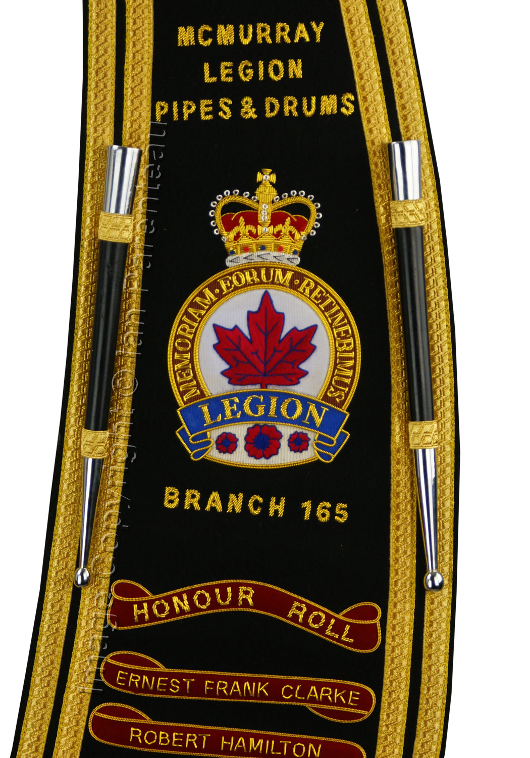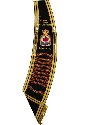This gold on black hand embroidered baldric sash was custom made for the McMurray Legion Branch 165 Pipes and Drums of Fort McMurray, Alberta.