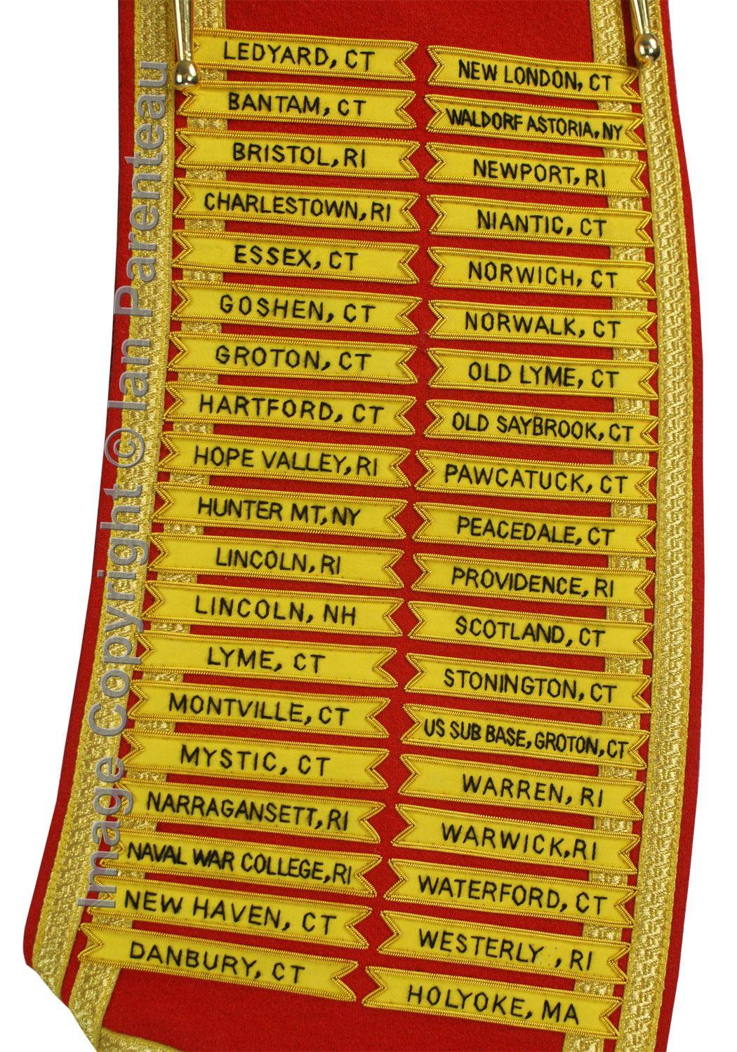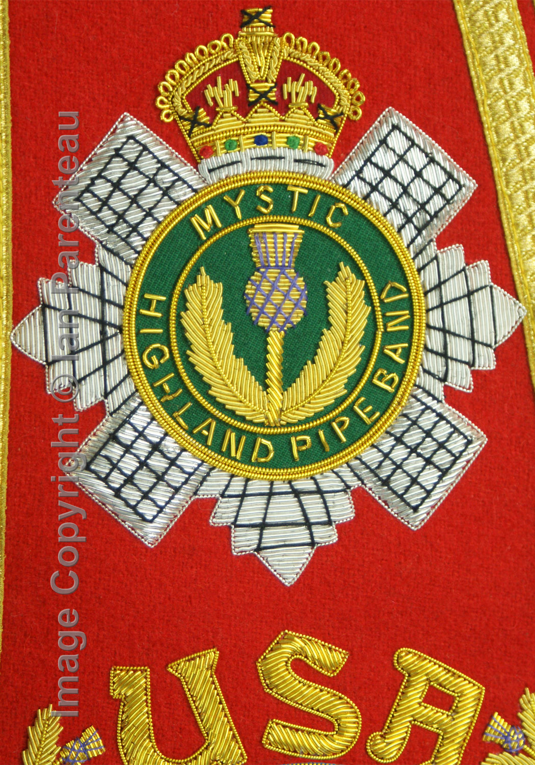 This gold on black hand embroidered baldric sash was custom made for the McMurray Legion Branch 165 Pipes and Drums of Fort McMurray, Alberta. Features include: |